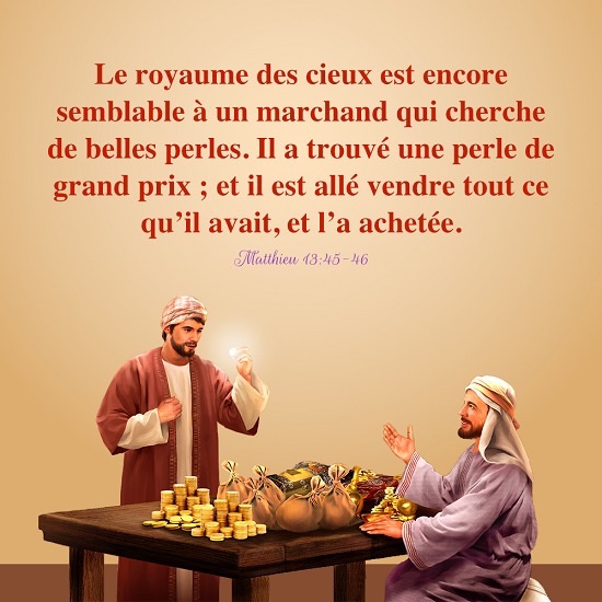 Ou encore : Le royaume des Cieux est comparable à un négociant qui recherche des perles fines.