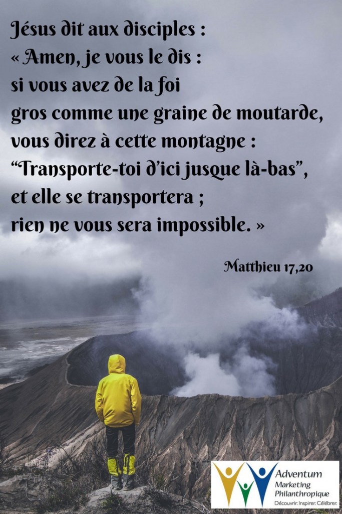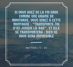 Jésus leur répond : « En raison de votre peu de foi. Amen, je vous le dis : si vous avez de la foi gros comme une graine de moutarde, vous direz à cette montagne : “Transporte-toi d’ici jusque là-bas”, et elle se transportera ; rien ne vous sera impossible. »