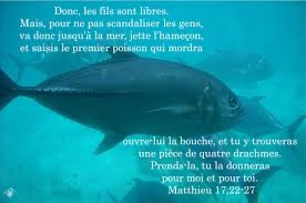 Mais, pour ne pas scandaliser les gens, va donc jusqu’à la mer, jette l’hameçon, et saisis le premier poisson qui mordra ; ouvre-lui la bouche, et tu y trouveras une pièce de quatre drachmes. Prends-la, tu la donneras pour moi et pour toi. »
