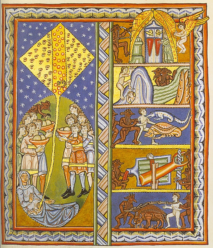 L’amour céleste… consiste pour l’homme à connaître et à reconnaître Dieu en l’aimant plus que tout. Cet amour proclame : « Douce vie et douce étreinte de la vie éternelle, bienheureuse félicité dans laquelle résident les récompenses éternelles, toi qui es toujours faite de véritables délices, si bien que jamais, en fait, je ne puis être remplie ni rassasiée de la joie intérieure qui est en mon Dieu. » L’amour du Ciel doit passer avant tout autre souci. Et chaque œuvre bonne est formée de deux parties : l’amour de Dieu et l’amour de l’homme. La discipline suit l’amour du Ciel. Elle est comme un enfant, puisqu’elle ne veut pas être puissante en accomplissant sa propre volonté, mais qu’elle veut rester fidèlement dans la crainte, la retenue et le respect. Par la foi en l’amour, l’homme se lie lui-même dans la loi de la discipline. (…) La vertu de miséricorde se lève pour aller vers les pauvres. Car la miséricorde de sa grâce se trouve dans le cœur du Père éternel. J’ai placé mon Fils dans la poitrine de la miséricorde, lorsque je l’ai envoyé dans le sein de la Vierge Marie. L’homme, justifié par les vertus, devient capable de regarder la misère de son prochain et de l’aider comme lui-même dans les vrais besoins. La miséricorde murmure : « Je tends toujours les mains vers les étrangers, les malheureux, les pauvres, les infirmes et ceux qui gémissent. » Après la miséricorde surgit la victoire par laquelle l’homme est vainqueur de lui-même et des vices d’autrui. (…) Enfin, la patience et le gémissement de l’âme possèdent une douceur qui empêche l’homme d’être écrasé par les épreuves. Libre de tout souci du siècle, il se tourne vers ce qui est éternel en Dieu dans la vie future.