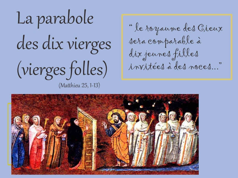 « Le royaume des Cieux sera comparable à dix jeunes filles invitées à des noces, qui prirent leur lampe pour sortir à la rencontre de l’époux.
