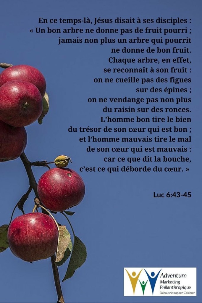 En ce temps-là, Jésus disait à ses disciples : «Un bon arbre ne donne pas de fruit pourri ; jamais non plus un arbre qui pourrit ne donne de bon fruit.