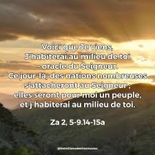 Ce jour-là, des nations nombreuses s’attacheront au Seigneur ; elles seront pour moi un peuple, et j’habiterai au milieu de toi. Alors tu sauras que le Seigneur de l’univers m’a envoyé vers toi. »
