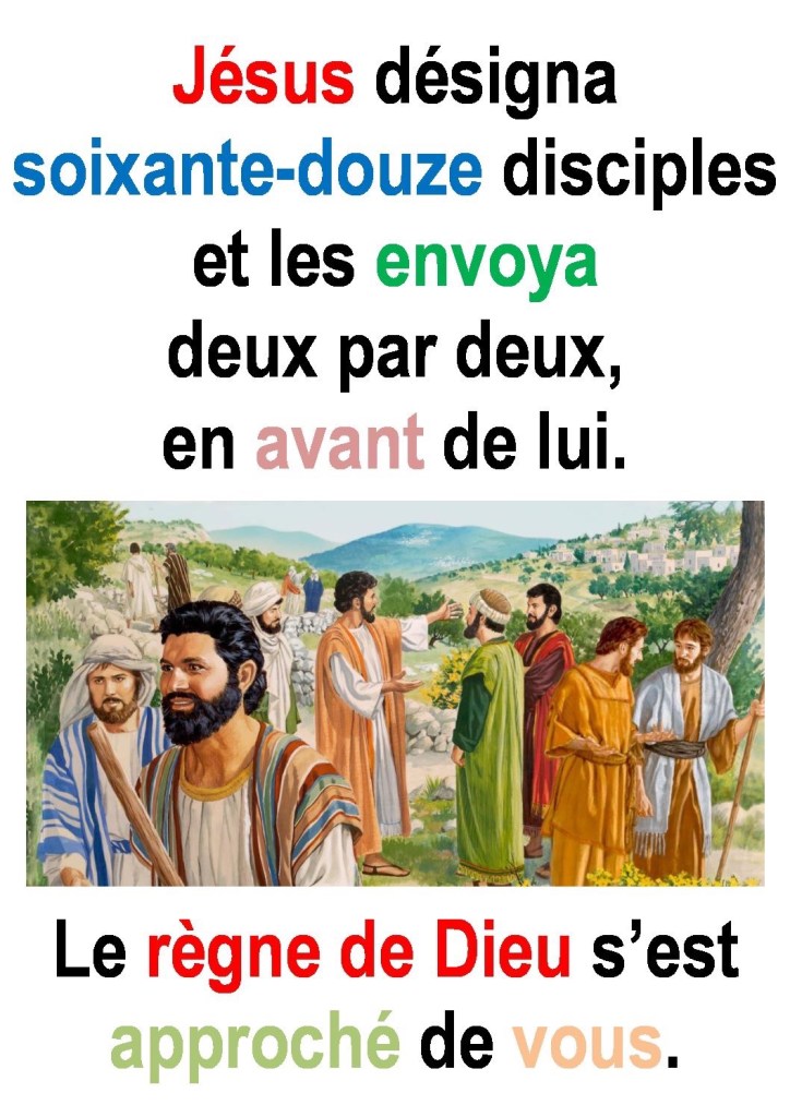 En ce temps-là, parmi les disciples, le Seigneur en désigna encore soixante-douze, et il les envoya deux par deux, en avant de lui, en toute ville et localité où lui-même allait se rendre.
