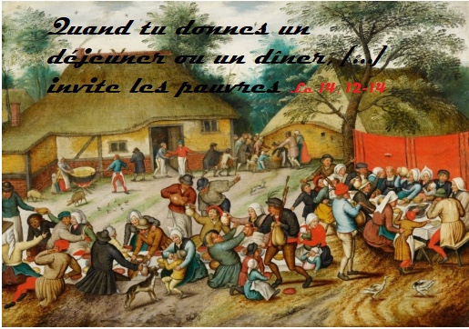 En ce temps-là, Jésus disait aussi à celui qui l’avait invité : « Quand tu donnes un déjeuner ou un dîner, n’invite pas tes amis, ni tes frères, ni tes parents, ni de riches voisins ; sinon, eux aussi te rendraient l’invitation et ce serait pour toi un don en retour.