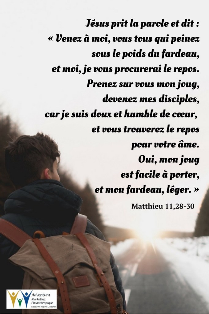 Prenez sur vous mon joug, devenez mes disciples, car je suis doux et humble de cœur, et vous trouverez le repos pour votre âme.