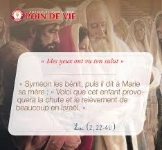 Syméon les bénit, puis il dit à Marie sa mère : « Voici que cet enfant provoquera la chute et le relèvement de beaucoup en Israël. Il sera un signe de contradiction