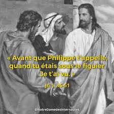 Nathanaël lui demande : « D’où me connais-tu ? » Jésus lui répond : « Avant que Philippe t’appelle, quand tu étais sous le figuier, je t’ai vu. »