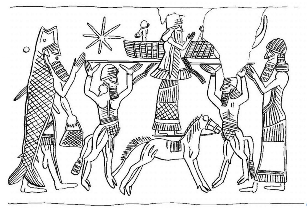 La scène représentée montre en son centre une divinité ailée debout sur un cheval et reliée, au niveau des hanches, à un plateau porté par deux hommes-taureaux. En haut à gauche apparaît une étoile à huit rayons, en haut à droite se voient les restes d’un croissant de lune. L’image est encadrée à gauche par un prêtre en costume de poisson et à droite par un homme qui prie en direction de la divinité. Cet ensemble indique clairement qu’il s’agit de la représentation anthropomorphique du dieu du soleil, qui est rattaché au firmament céleste, lequel est à son tour porté par des êtres hybrides.
