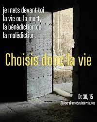 Je prends aujourd’hui à témoin contre vous le ciel et la terre : je mets devant toi la vie ou la mort, la bénédiction ou la malédiction. Choisis donc la vie, pour que vous viviez, toi et ta descendance,