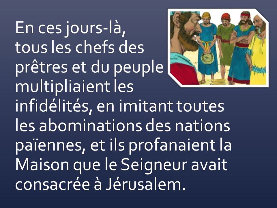 En ces jours-là, tous les chefs des prêtres et du peuple multipliaient les infidélités, en imitant toutes les abominations des nations païennes, et ils profanaient la Maison que le Seigneur avait consacrée à Jérusalem.