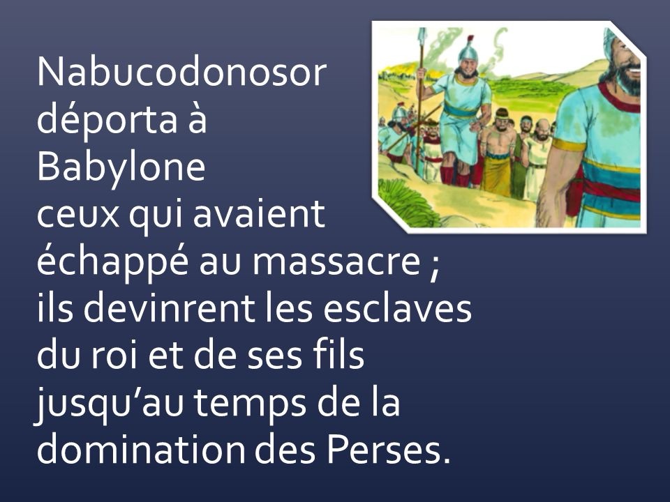 Nabucodonosor déporta à Babylone ceux qui avaient échappé au massacre ; ils devinrent les esclaves du roi et de ses fils jusqu’au temps de la domination des Perses.