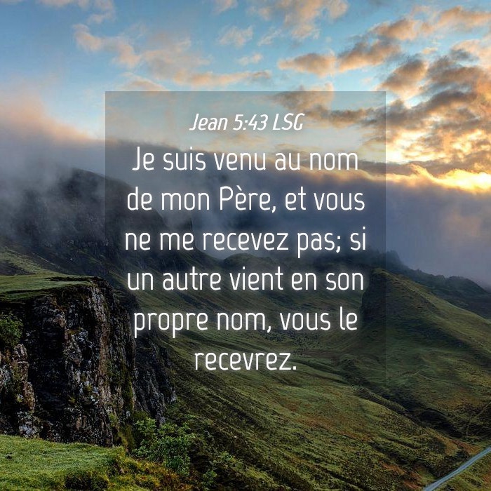 Moi, je suis venu au nom de mon Père, et vous ne me recevez pas ; qu’un autre vienne en son propre nom, celui-là, vous le recevrez !
