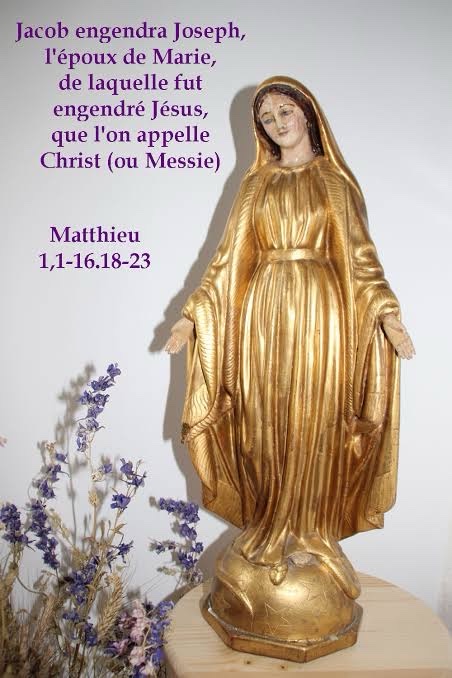 Jacob engendra Joseph, l’époux de Marie, de laquelle fut engendré Jésus, que l’on appelle Christ.