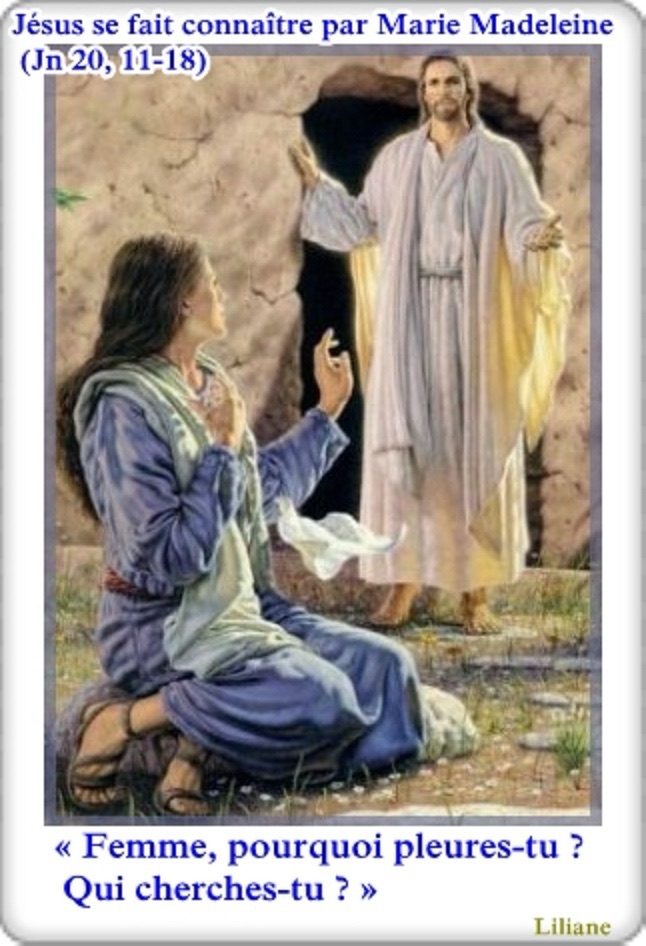 Jésus lui dit : « Femme, pourquoi pleures-tu ? Qui cherches-tu ? » Le prenant pour le jardinier, elle lui répond : « Si c’est toi qui l’as emporté, dis-moi où tu l’as déposé, et moi, j’irai le prendre. »