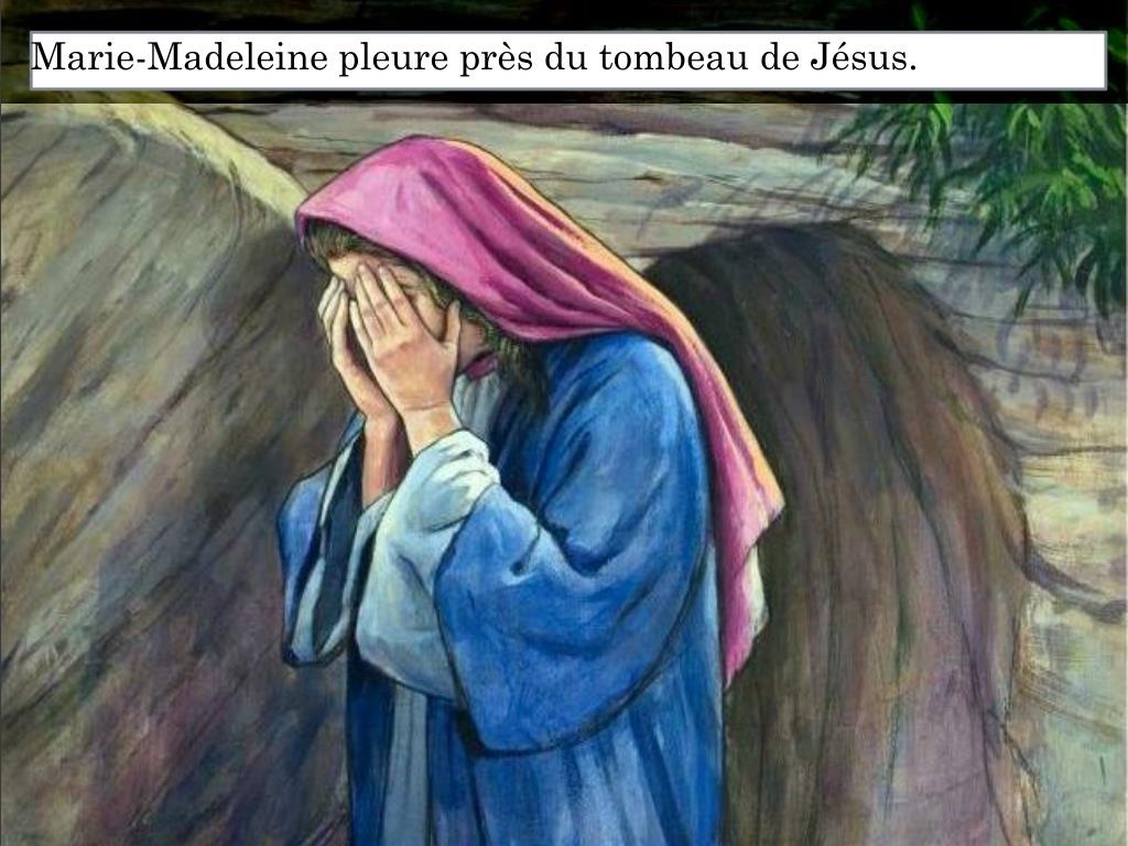 En ce temps-là, Marie Madeleine se tenait près du tombeau, au-dehors, tout en pleurs. Et en pleurant, elle se pencha vers le tombeau.