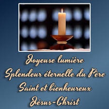 Nous te bénissons, Père des lumières, Christ, Verbe de Dieu, splendeur du Père, Lumière de lumière, et source de lumière, Esprit de feu, souffle du Fils comme du Père. Trinité Sainte, lumière indivisée, Tu dissipas les ténèbres pour créer Un monde lumineux, d’ordre et de beauté, Qui porterait ta ressemblance. De raison et sagesse tu éclairas l’homme, L’illuminas du sceau de ton Image, Pour que dans ta lumière, il voie la lumière (Ps 36,10), Et tout entier devienne lumière. Tu fis briller au ciel d’innombrables lumières, Ordonnas au jour et à la nuit De s’entendre à se partager le temps Tour à tour, paisiblement. La nuit met fin au travail du corps fatigué, Le jour appelle aux œuvres que tu aimes, Nous apprend à fuir les ténèbres, à nous hâter Vers ce jour qui n’aura plus de nuit.