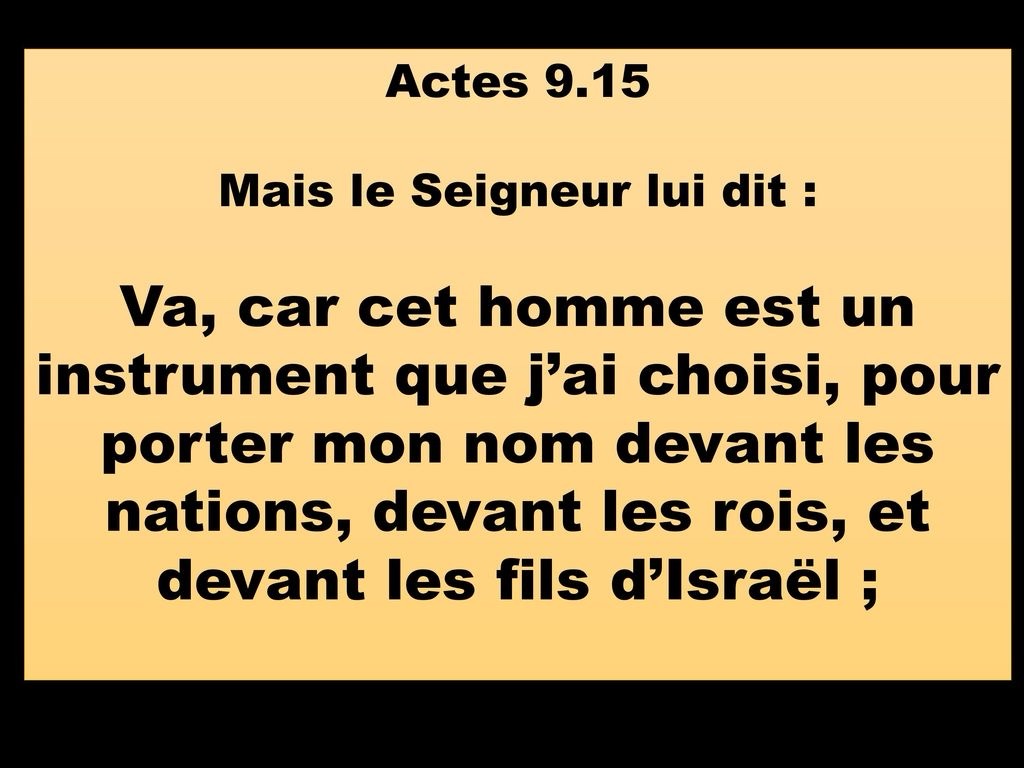 Mais le Seigneur lui dit : « Va ! Car cet homme est l’instrument que j’ai choisi pour faire parvenir mon nom auprès des nations, des rois et des fils d’Israël.