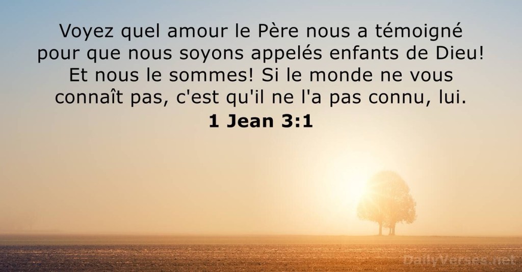 Bien-aimés, voyez quel grand amour nous a donné le Père pour que nous soyons appelés enfants de Dieu – et nous le sommes. Voici pourquoi le monde ne nous connaît pas : c’est qu’il n’a pas connu Dieu.