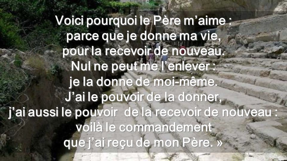 Nul ne peut me l’enlever : je la donne de moi-même. J’ai le pouvoir de la donner, j’ai aussi le pouvoir de la recevoir de nouveau : voilà le commandement que j’ai reçu de mon Père. »