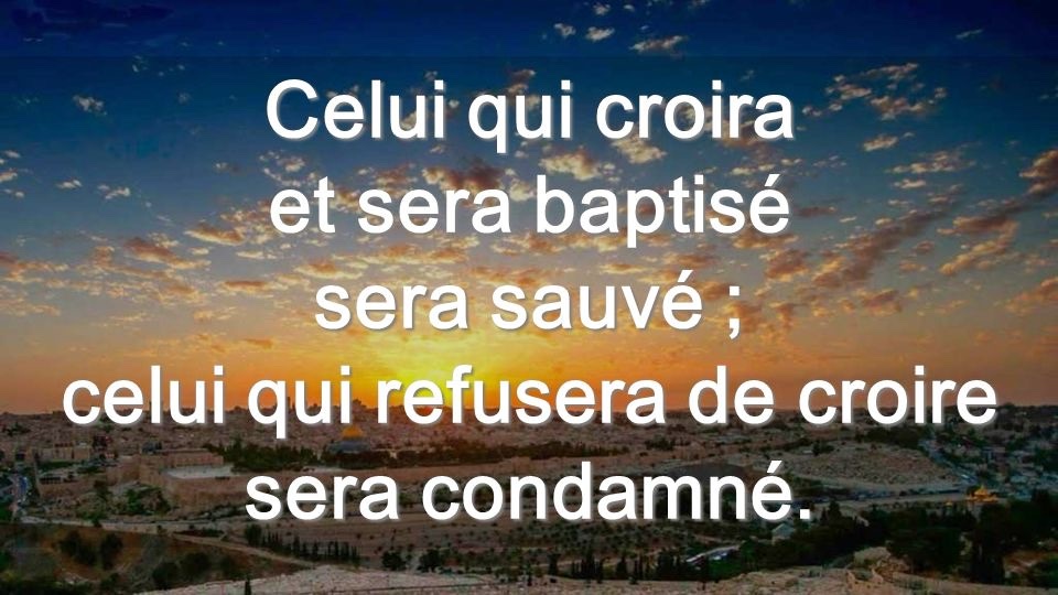 Celui qui croira et sera baptisé sera sauvé ; celui qui refusera de croire sera condamné.