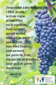 Tout sarment qui est en moi, mais qui ne porte pas de fruit, mon Père l’enlève ; tout sarment qui porte du fruit, il le purifie en le taillant, pour qu’il en porte davantage.