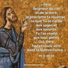 En ce temps-là, Jésus prit la parole et dit : « Père, Seigneur du ciel et de la terre, je proclame ta louange : ce que tu as caché aux sages et aux savants, tu l’as révélé aux tout-petits.