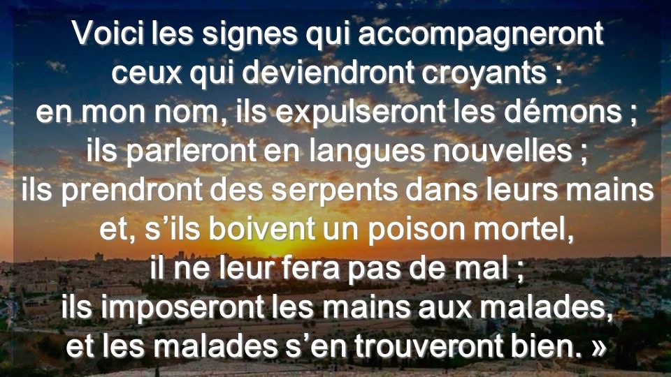ils prendront des serpents dans leurs mains et, s’ils boivent un poison mortel, il ne leur fera pas de mal ; ils imposeront les mains aux malades, et les malades s’en trouveront bien. »