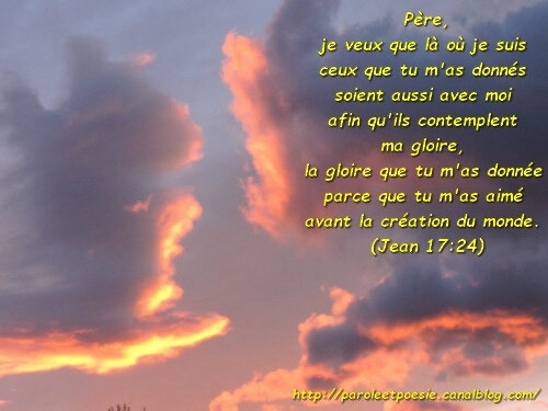 Père, ceux que tu m’as donnés, je veux que là où je suis, ils soient eux aussi avec moi, et qu’ils contemplent ma gloire, celle que tu m’as donnée parce que tu m’as aimé avant la fondation du monde.