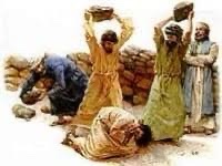 Alors arrivèrent les deux individus qui se placèrent en face de lui et portèrent contre lui ce témoignage : « Naboth a maudit Dieu et le roi. » On fit sortir Naboth de la ville, on le lapida, et il mourut.