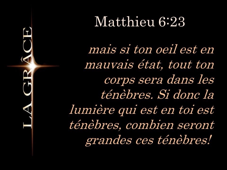 mais si ton œil est mauvais, ton corps tout entier sera dans les ténèbres. Si donc la lumière qui est en toi est ténèbres, comme elles seront grandes, les ténèbres ! »