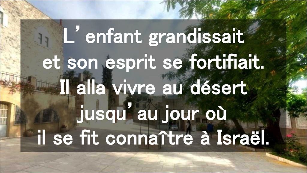 L’enfant grandissait et son esprit se fortifiait. Il alla vivre au désert jusqu’au jour où il se fit connaître à Israël.