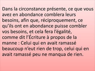 Dans la circonstance présente, ce que vous avez en abondance comblera leurs besoins, afin que, réciproquement, ce qu’ils ont en abondance puisse combler vos besoins, et cela fera l’égalité,