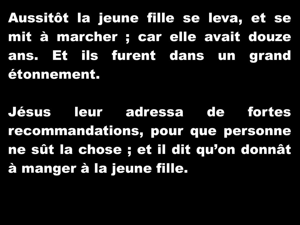 Aussitôt la jeune fille se leva et se mit à marcher – elle avait en effet douze ans. Ils furent frappés d’une grande stupeur.