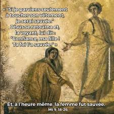 Jésus lui dit alors : « Ma fille, ta foi t’a sauvée. Va en paix et sois guérie de ton mal. »
