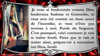 « J’ai tout détruit chez vous, comme Dieu a détruit Sodome et Gomorrhe ; vous étiez comme un tison sauvé de l’incendie. Et vous n’êtes pas revenus à moi ! – oracle du Seigneur.