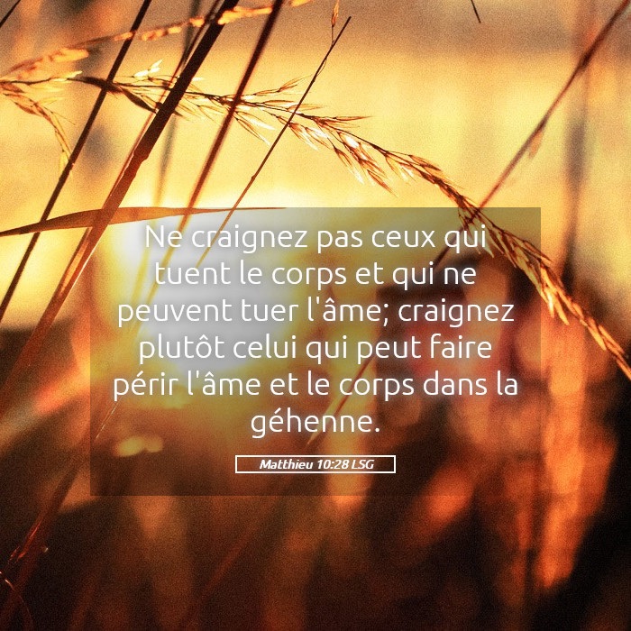 Ne craignez pas ceux qui tuent le corps sans pouvoir tuer l’âme ; craignez plutôt celui qui peut faire périr dans la géhenne l’âme aussi bien que le corps.