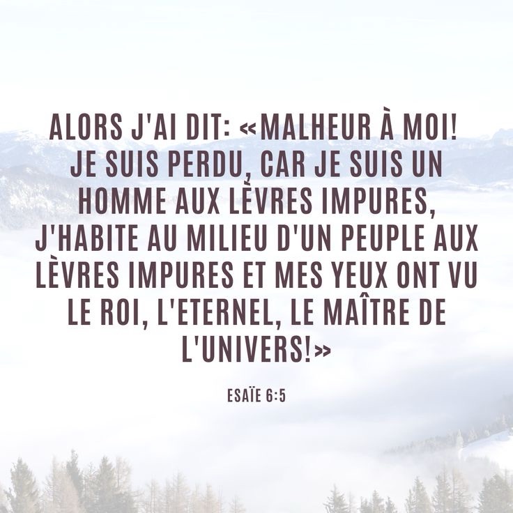Je dis alors : « Malheur à moi ! je suis perdu, car je suis un homme aux lèvres impures, j’habite au milieu d’un peuple aux lèvres impures : et mes yeux ont vu le Roi, le Seigneur de l’univers ! »