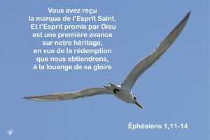 En lui, vous aussi, après avoir écouté la parole de vérité, l’Évangile de votre salut, et après y avoir cru, vous avez reçu la marque de l’Esprit Saint. Et l’Esprit promis par Dieu