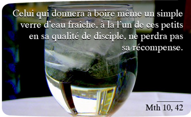 Et celui qui donnera à boire, même un simple verre d’eau fraîche, à l’un de ces petits en sa qualité de disciple, amen, je vous le dis : non, il ne perdra pas sa récompense. »