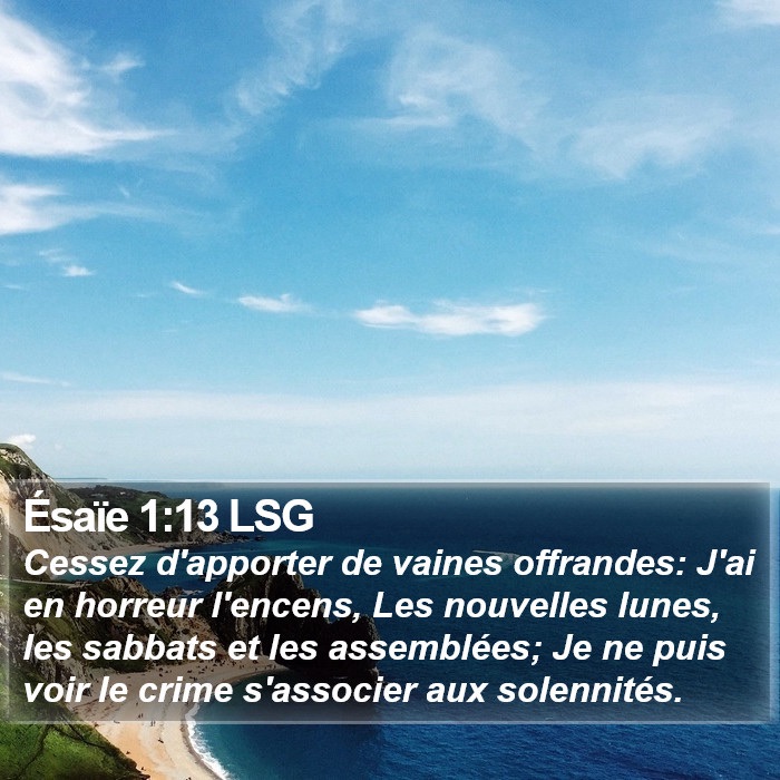 Cessez d’apporter de vaines offrandes ; j’ai horreur de votre encens. Les nouvelles lunes, les sabbats, les assemblées, je n’en peux plus de ces crimes et de ces fêtes.