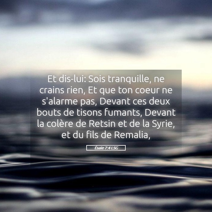 Tu lui diras : “Garde ton calme, ne crains pas, ne va pas perdre cœur devant ces deux bouts de tisons fumants, à cause de la colère brûlante du roi d’Aram et du roi d’Israël,