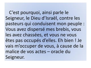C’est pourquoi, ainsi parle le Seigneur, le Dieu d’Israël, contre les pasteurs qui conduisent mon peuple : Vous avez dispersé mes brebis, vous les avez chassées, et vous ne vous êtes pas occupés d’elles. Eh bien ! Je vais m’occuper de vous, à cause de la malice de vos actes – oracle du Seigneur.