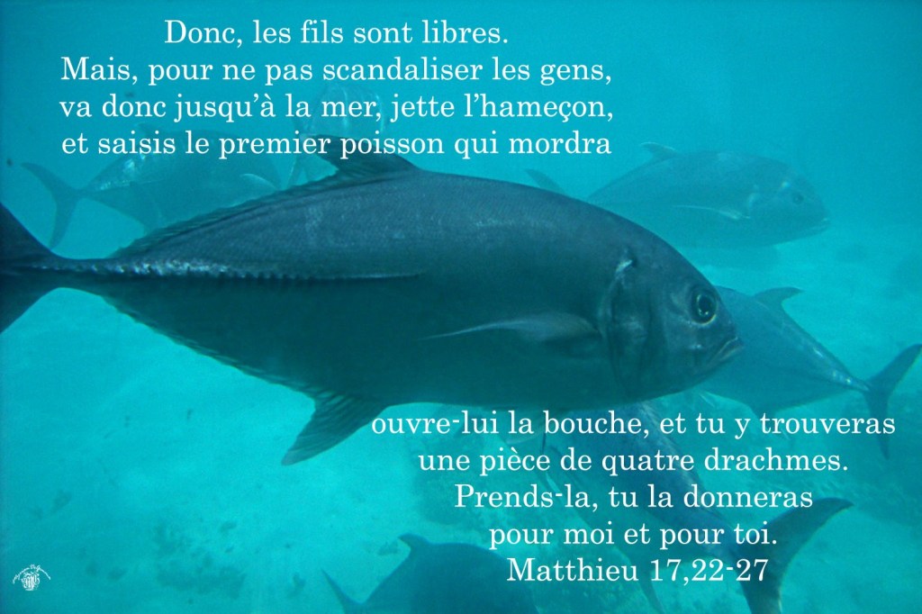 Mais, pour ne pas scandaliser les gens, va donc jusqu’à la mer, jette l’hameçon, et saisis le premier poisson qui mordra ; ouvre-lui la bouche, et tu y trouveras une pièce de quatre drachmes. Prends-la, tu la donneras pour moi et pour toi. »
