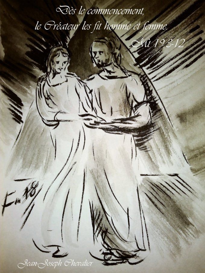 Selon son dessein dès l’origine, Dieu a créé l’homme et la femme à son image. L’Écriture dit : « À l’image de Dieu il le créa, homme et femme il les créa » (Gn 1,27). Il est donc important de comprendre, dans le livre de la Genèse, cette grande vérité : l’image de lui-même que Dieu a placée dans l’homme passe aussi à travers la complémentarité des sexes. L’homme et la femme, qui s’unissent dans le mariage, reflètent l’image de Dieu et sont en quelque sorte la révélation de son amour. Non seulement de l’amour que Dieu nourrit pour l’être humain, mais aussi de la mystérieuse communion qui caractérise la vie intime des trois Personnes divines. En outre, on peut considérer comme image de Dieu l’engendrement lui-même, qui fait de la famille un sanctuaire de la vie. L’apôtre Paul dit que « toute parenté tire son nom de Dieu » (Ep 3,14-15). C’est lui qui est la source ultime de la vie. On peut donc affirmer que la généalogie de toute personne plonge ses racines dans l’éternel. En engendrant un enfant, les parents agissent comme collaborateurs de Dieu. Mission vraiment sublime ! Par conséquent, il n’est pas étonnant que Jésus ait voulu élever le mariage à la dignité de sacrement, et que saint Paul en parle comme d’un « grand mystère », le mettant en relation avec l’union du Christ et son Église (Ep 5,32).