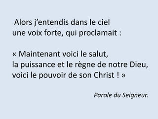 « Maintenant voici le salut, la puissance et le règne de notre Dieu, voici le pouvoir de son Christ ! »