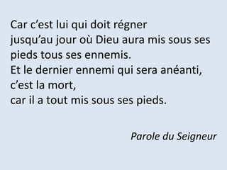 Car c’est lui qui doit régner jusqu’au jour où Dieu aura mis sous ses pieds tous ses ennemis.