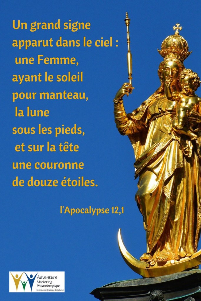 Un grand signe apparut dans le ciel : une Femme, ayant le soleil pour manteau, la lune sous les pieds, et sur la tête une couronne de douze étoiles.