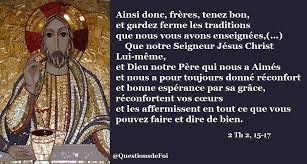 Ainsi donc, frères, tenez bon, et gardez ferme les traditions que nous vous avons enseignées, soit de vive voix, soit par lettre.