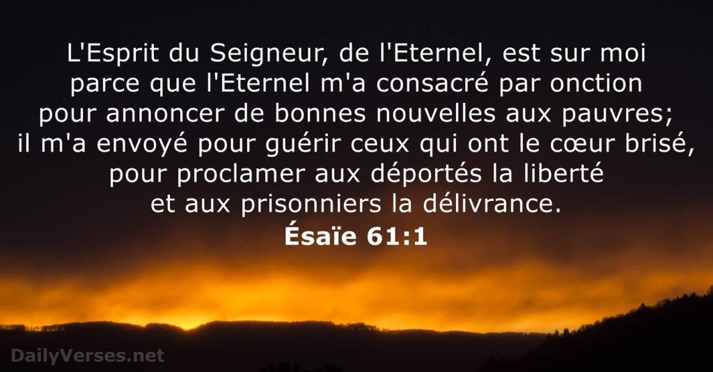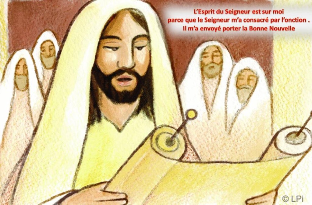 ‘L’Esprit du Seigneur est sur moi parce que le Seigneur m’a consacré par l’onction. Il m’a envoyé porter la Bonne Nouvelle aux pauvres, annoncer aux captifs leur libération, et aux aveugles qu’ils retrouveront la vue, remettre en liberté les opprimés,